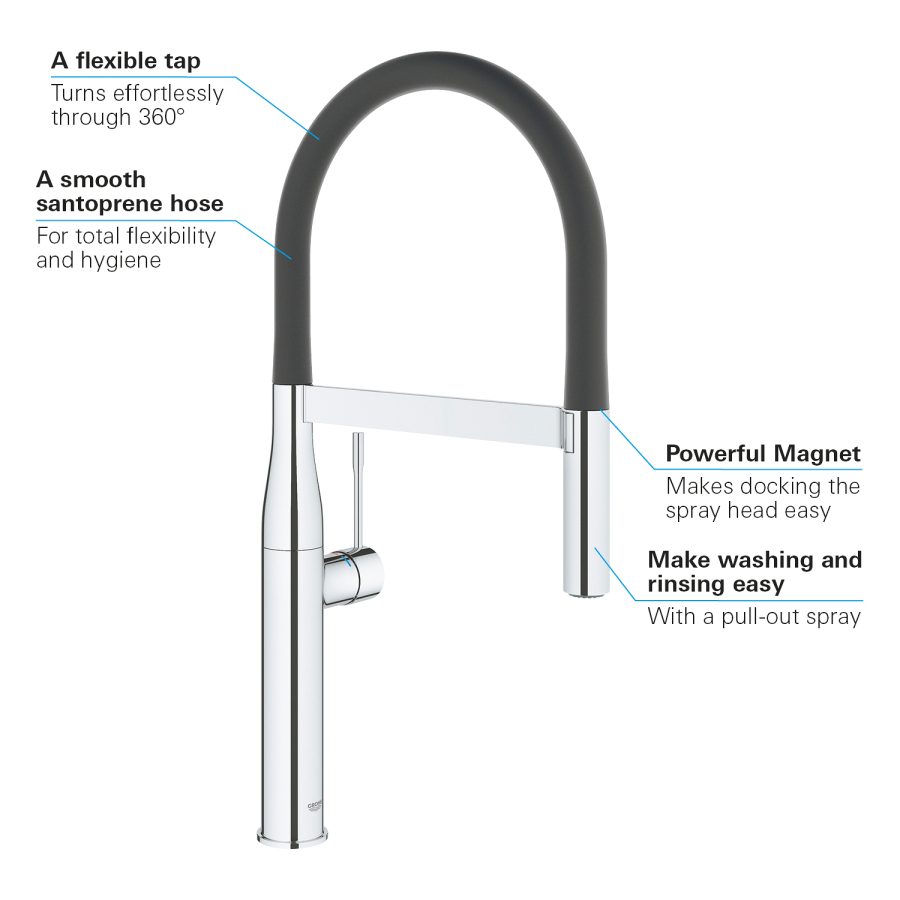 GROHE StarLight krom kaplama GROHE SilkMove 28 mm seramik kartuş profesyonel sprey Esnek, hijyenik GrohFlexx santopren mutfak hortumu divertör: normal akış ve jet akış normal akışa otomatik geçiş GROHE Easydock M , spiral çıkış ucunun yerine kusursuz bir şekilde oturması için entegre mıknatıs döner çıkış ucu, hareket ekseni 360°, entegre çek valf spiral bağlantı hortumları, hızlı montaj sistemi