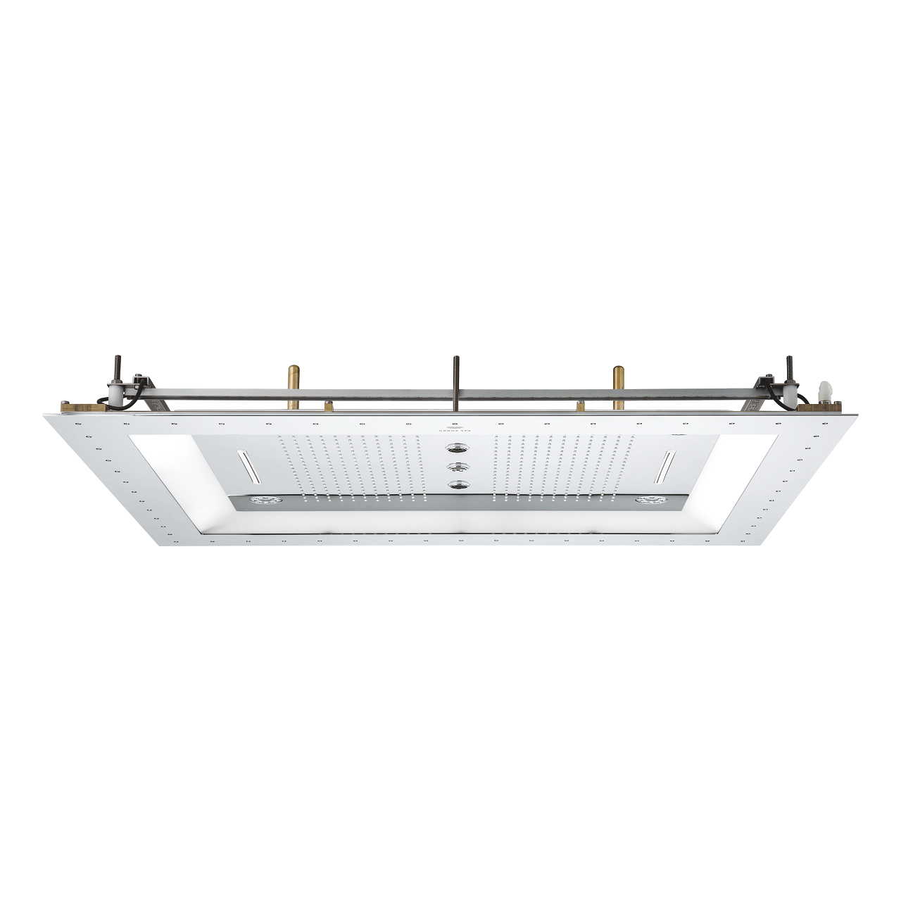 Gelince Haber VerÖlçüler: 1016 mm x 762 mm x 145 mm. Malzeme: metal. Dk. akış hızı 25 l/dak. Önerilen basınç 3,0 bar. 1 x Su Perdesi. 1 x Pure XL sprey. 1 x 2 sis spreyi. 2 x GROHE PureRain sprey 400 x 190 mm. 2 x XL Şelale (ayrıca kontrol edilir). 1 x 4 Bokoma Sprey, 20° ayar açısı ile. Tam spektrumlu LED: değişen gökkuşağı renkleriyle yumuşak ışık. Ayrı ayrı ayarlanabilir: renk seçimli kalıcı aydınlatma. Işık için güç kaynağı 12 V DC. SpeedClean kireç önleyici sistem. GROHE DreamSpray mükemmel sprey deseni. GROHE Uzun Ömürlü kaplama. Kaba set (26 865 000), F-digital Deluxe ana ünite kutusu (26 864 000), Bluetooth ünitesi (36 475 000) ve çeşitli kablo bağlantıları gerektirir; bunların tümü kurulum durumuna göre ayrıca sipariş edilmelidir. Ürüne dahil değildir. Tavan konstrüksiyonu ürünün statik gereksinimine uygun olmalıdır (toplam ürün ağırlığı > 70 kg). Drenajın performansı yeterli büyüklükte olmalıdır (> 100 l/dak). Öneri: Grohtherm SmartControl ile yapılandırma 3 x Grohtherm SmartControl (29 126 000)3 x GROHE Rapido SmartBox (35 604 000)1 x Rainshower Aqua Cube Stick duvar tutucu seti 1 sprey (26 886 000) Üründe değiştirilemeyen dahili LED lambalar bulunmaktadır: Enerji verimlilik sınıfı