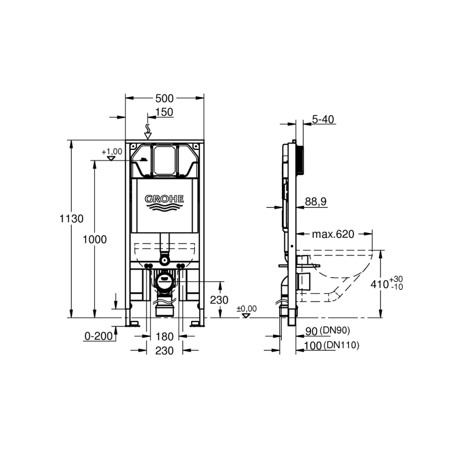 duvar üstü montajlar veya alçıpan uygulamalar için elektrostatik kaplamalı çelik çerçeve, kendinden destekli kuru kaplama için komple ön montajlı sabit bağlantılar ile 2 WC sabitleme civatası, 180/230 mm mesafeli sabitleme civataları Çıkış çapı Ø 90 mm derinlik ayarlanabilir redüksiyon Ø 90/110 mm giriş ve çıkış bağlantı seti