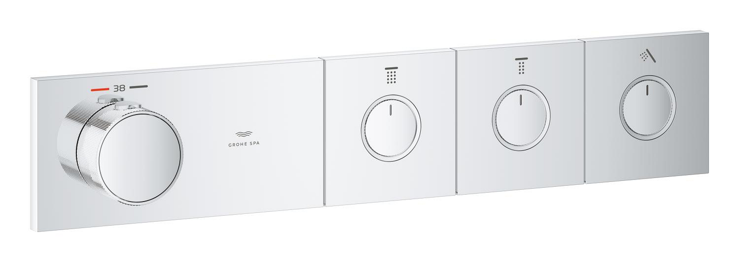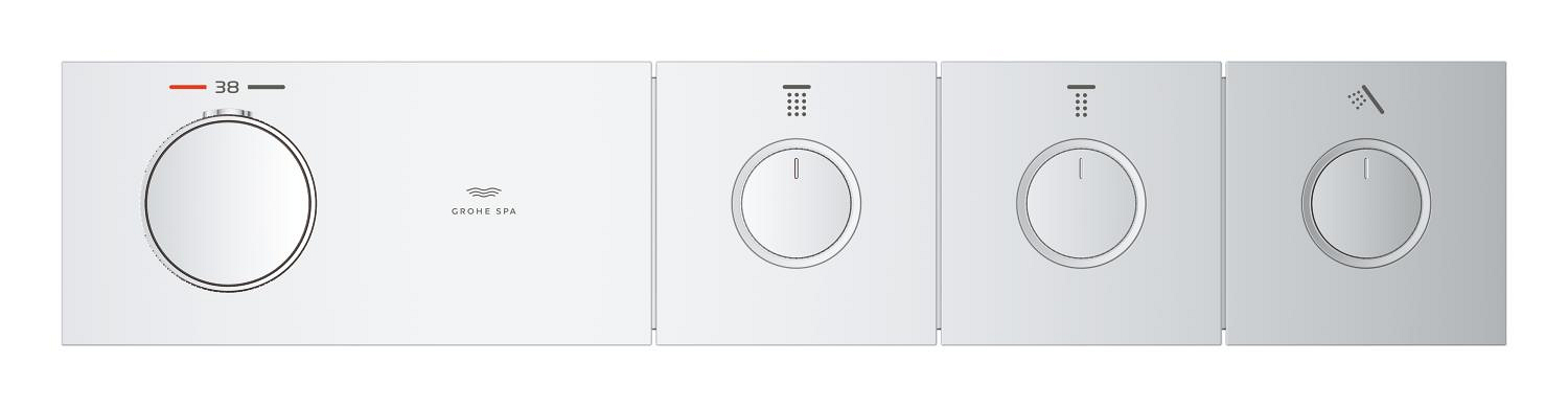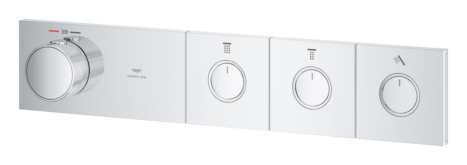 Gelince Haber VerGROHE SmartControl işletimi ve termostat teknolojisi sayesinde optimum konfor. GROHE SPA, şık ve yer tasarrufu sağlayan gizli montaj için ideal olan modüler Rainshower Aqua/Grohtherm Aqua Tiles duş koleksiyonunu sunar. Klasik tasarımı ve son teknoloji işlevselliği, optimal bir duş deneyimi sağlar. Kişisel isteklerinizi karşılamak için birçok renk ve işletim seçeneğinin tadını çıkarın – hepsi GROHE'nin eşsiz kalitesi ve estetiği ile. GROHE Grohtherm Aqua Tiles gizli montaj için 3 fonksiyonlu termostat, yüksek kaliteli bir duş setinin merkez parçasıdır. GROHE SmartControl'un kullanıcı dostu itme ve döndürme işlemi ile etkileyici bir performans sergiler. Her bir fonksiyon, bir düğmeye dokunarak zahmetsizce etkinleştirilebilir veya devre dışı bırakılabilir. Su miktarı, düğmeyi döndürerek hassas ve sürekli bir şekilde ayarlanabilir. Farklı duşlar ve sprey türleri de birbiriyle birleştirilebilir. Geri çekilebilir düğmeler, sağlam metalden yapılmıştır ve dişli yapısı sayesinde kaymaz. Sıcaklık regülatörü, sıcaklığın kazara 38 °C'yi aşmasını önleyen entegre bir yanık önleyici özelliğe sahiptir ve gerekirse 43 °C'de ikinci bir güvenlik kilidi eklenebilir. Teslimat kapsamı, aşağıdaki sembollerle birlikte 4 değiştirilebilir metal kapak plakasını içerir: baş duşu 1, baş duşu 2, el duşu ve musluk. Bu, gerekli anahtarlama fonksiyonlarını özelleştirmenizi sağlar – GROHE Grohtherm Aqua Tiles tavan montajını tercih edip etmediğinize bağlı olarak.