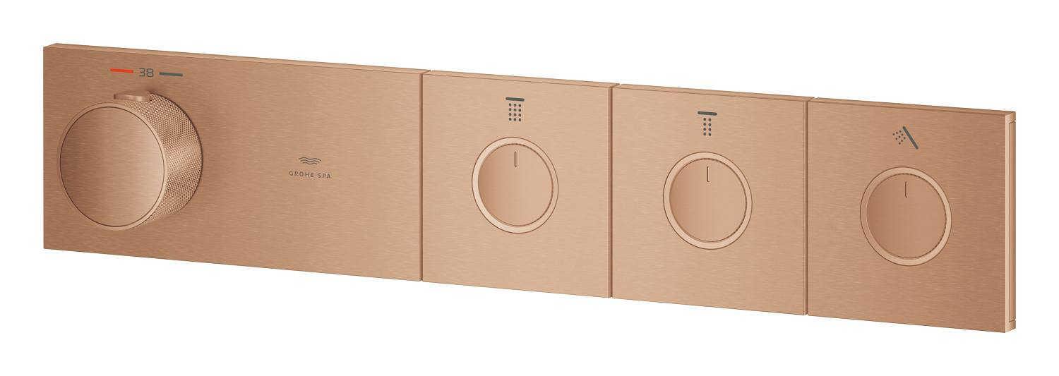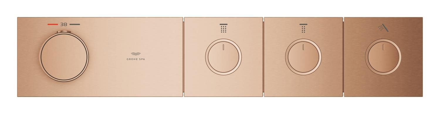 Gelince Haber VerThe modular Rainshower Aqua/Grohtherm Aqua Tiles shower collection from GROHE SPA is designed for elegant and space-saving concealed installation and is characterised by its timelessly simple design and state-of-the-art functionality. It offers numerous colour and operating options for a deluxe shower experience tailored to your individual preferences – with incomparable GROHE aesthetics and quality. The GROHE Grohtherm Aqua Tiles thermostat for concealed installation with 3 functions is the central control unit of a first-class shower system. It impresses with its intuitive operation with the push and turn mechanism of GROHE SmartControl. Each function can be activated or deactivated separately at the touch of a button. The amount of water can be adjusted precisely and continuously by turning the knob, and it is possible to combine different showers and spray types. The retractable knobs are made of sturdy metal and have a non-slip knurled structure. The temperature regulator has an integrated anti-scald feature that prevents the temperature from accidentally exceeding 38 °C, and a second safety lock at 43 °C can be added if required. The scope of delivery includes four interchangeable metal cover plates with the symbols for head shower 1, head shower 2, hand shower and bath spout. This allows you to set the required switching functions individually – depending on which GROHE Grohtherm Aqua Tiles ceiling, head and/or hand shower you prefer for the shower or bathtub. In conju