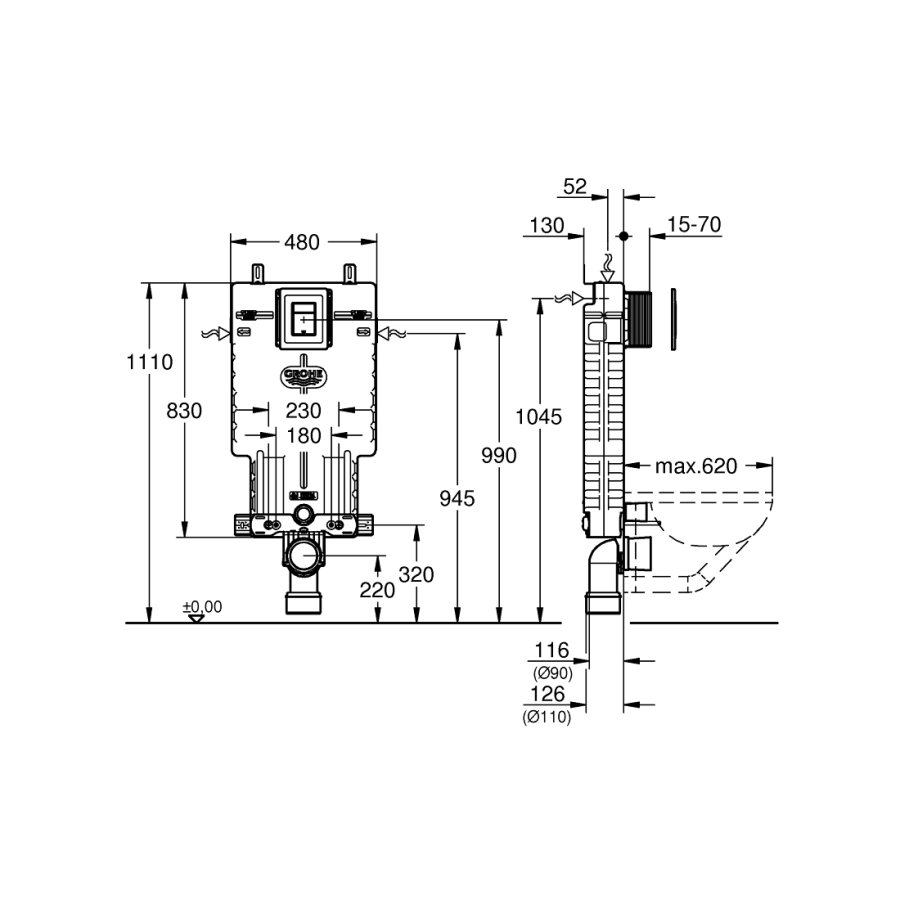 Grohe Rapid Slx 3'Ü 1 Arada Wc Gömme Rezervuar Seti, 1.13 M Montaj Yüksekliği - 39603000