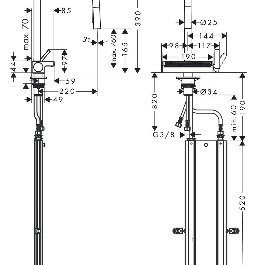 • Lavabo tezgahının altında, dolabın içinde hortumu sessiz, rahat ve korumalı bir şekilde çalıştırmak için sBox