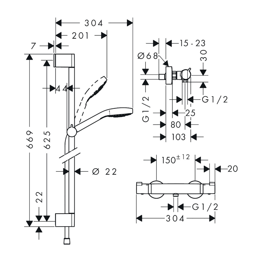 • şunları içerir:: el duşu, duş termostatı, duş barı, el duşu askısı, duş hortumu