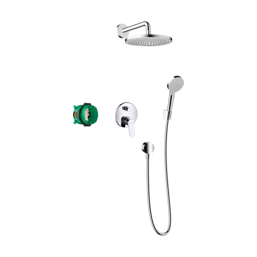 • şunları içerir:: tepe duşu, el duşu, duş dirseği, Tek kollu banyo bataryası, iç set, duvar çıkışı, duş askısı, duş hortumu duş başlığı ölçüsü: 240 mm sprey türü tepe duşu: Rainel duşu sprey tipi: Rain, IntenseRain duş hortumu somunu: iki taraflı konik somuna sahip duş hortumu hortum bükülmelerine karşı hareketli bağlantımaks. çalışma basıncı: 6 bar min. çalışma basıncı: 1 bar