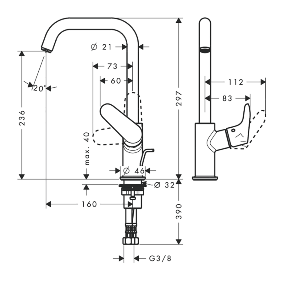 • volanın yandan görünümü: ana gövdenin alt kısmı (çanak lavabolar için uygun değil)
