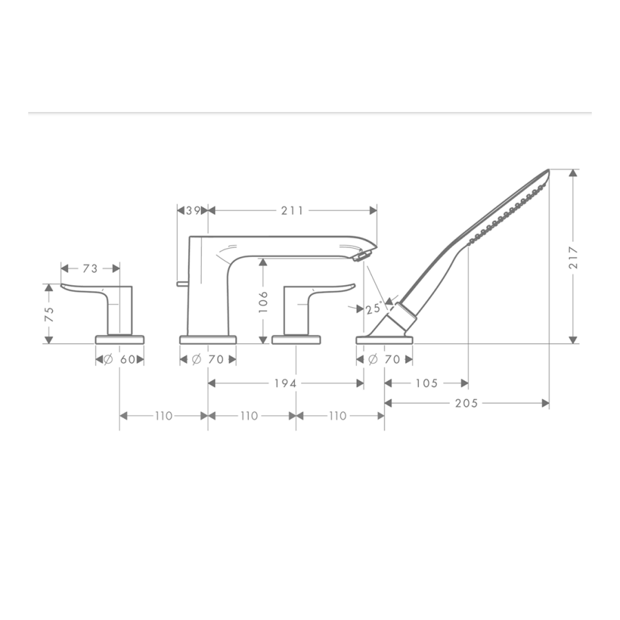 • şunları içerir:: 4-delikli küvet kenarı banyo bataryası, baton el duşu, duş askısı projeksiyon: 220 mm batarya sprey tipi: Normal sprey el duşu sprey tipi: RainAir el duşunun maksimum çekme uzunluğu: 1,10 m maksimum akış miktarı (3 bar basınçta): 25 l/dk banyo gagası akış miktarı (3 bar basınçta): 25 l/dk el duşu akış miktarı (3 bar basınçta): 17 l/dk seramik valf sıcak/soğuk 90°gürültü sınıfı: I bağlantı türü: iç set akış miktarı sınıfı: C, B
