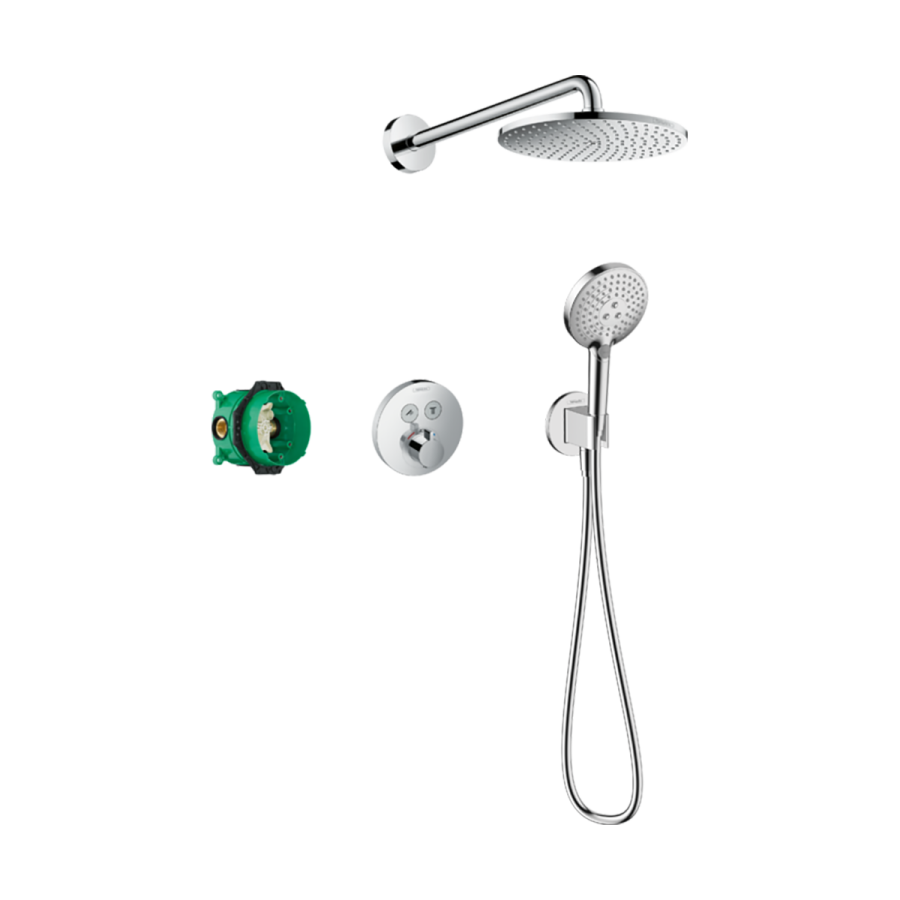 • şunları içerir:: tepe duşu, el duşu, duş termostatı, iç set, duvar çıkışı, duş hortumu duş başlığı ölçüsü: 240 mm sprey türü tepe duşu: PowderRainel duşu sprey tipi: PowderRain, Rain, Whirl maksimum akış miktarı (3 bar basınçta): 18,1 l/dk duş hortumu somunu: iki taraflı konik somuna sahip duş hortumu hortum bükülmelerine karşı hareketli bağlantımaks. çalışma basıncı: 6 bar min. çalışma basıncı: 1 bar bağlantı türü: iç set