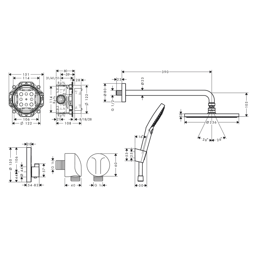 • şunları içerir:: tepe duşu, el duşu, Termostat, iç set, duvar çıkışı, duş askısı, duş hortumu duş başlığı ölçüsü: 240 mm sprey türü tepe duşu: PowderRainel duşu sprey tipi: RainAir, Rain, Whirl maksimum akış miktarı (3 bar basınçta): 18,1 l/dk duş hortumu somunu: iki taraflı konik somuna sahip duş hortumu hortum bükülmelerine karşı hareketli bağlantımaks. çalışma basıncı: 6 bar min. çalışma basıncı: 1 bar bağlantı türü: iç set