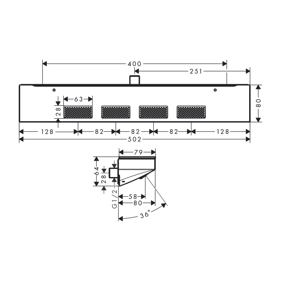 • duş başlığı ölçüsü: 502 x 80 mm sprey türü: PowderRain sprey alanı: 309 x 28 mm uygulama alanı: tepe, omuz veya yan duş olarak kullanılabilir maksimum akış miktarı (3 bar basınçta): 14,5 l/dk PowderRain sprey akış miktarı (3 bar basınçta): 14,5 l/dk bağlantı dişlisi: G ½ malzeme: metal güvenli camdan üretilmiş rafgürültü sınıfı: II akış miktarı sınıfı: S raf yüzeyi: ayna camı