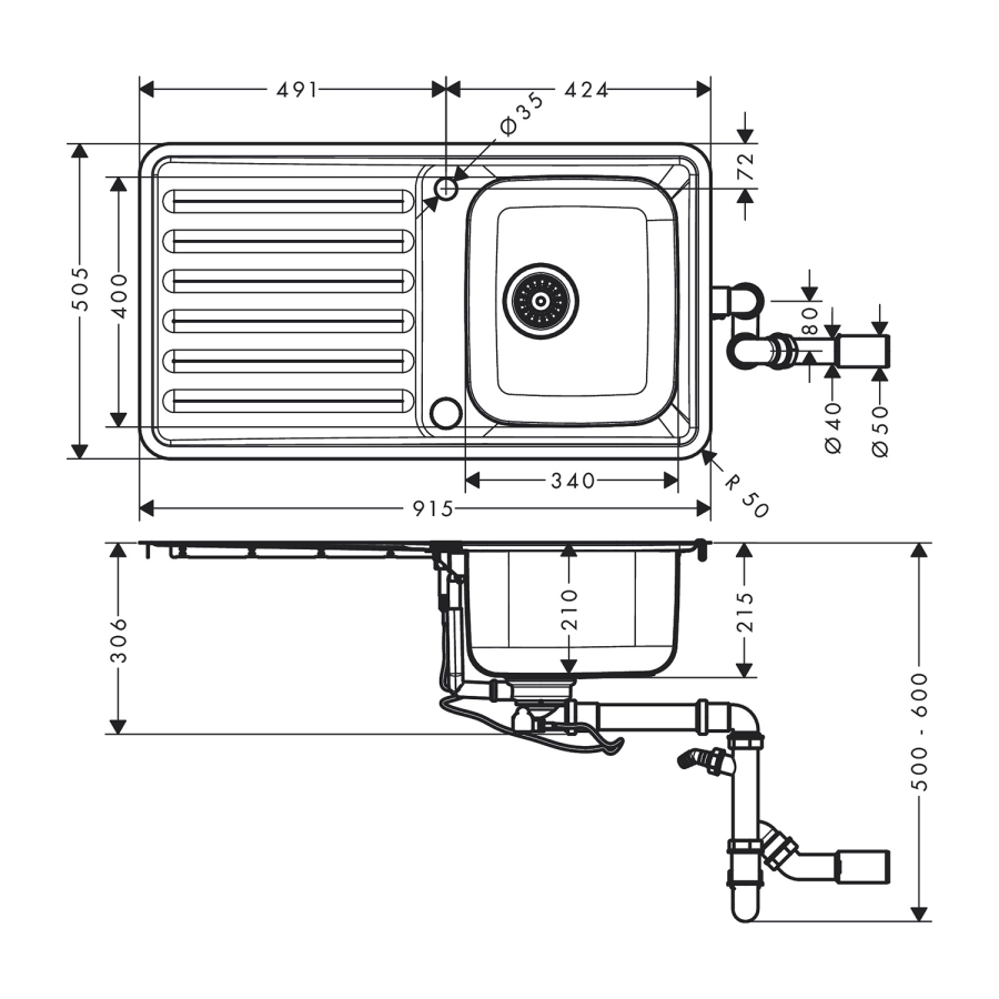 • eviye derinliği: 210 mm