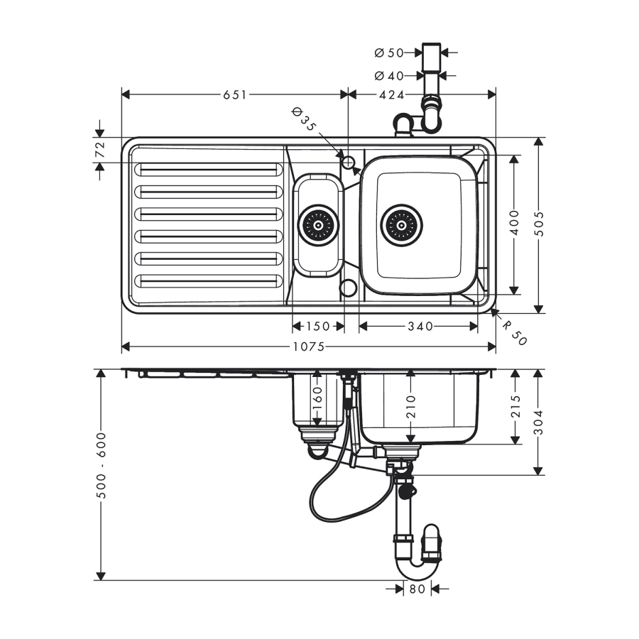 • eviye derinliği: 210 mm
