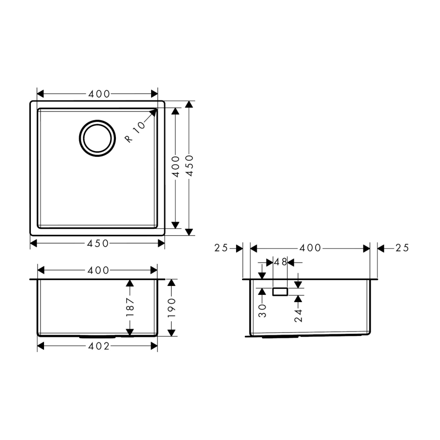 • genel ölçüler: 398 x 398 mm malzeme: paslanmaz çelik çanak sayısı: 1 ana hazne batarya deliksizkabin ölçüsü: 50 cm montaj türü: alttan montaj, tezgah üstü veya yüzeye sıfır montaj taşma pozisyonu: çanağın sağ tarafında köşe yarıçapı: 10 mm eviye derinliği: 190 mm atık seti dahil değildir - lütfen gerekli parçalardan bir gider seti sipariş edin