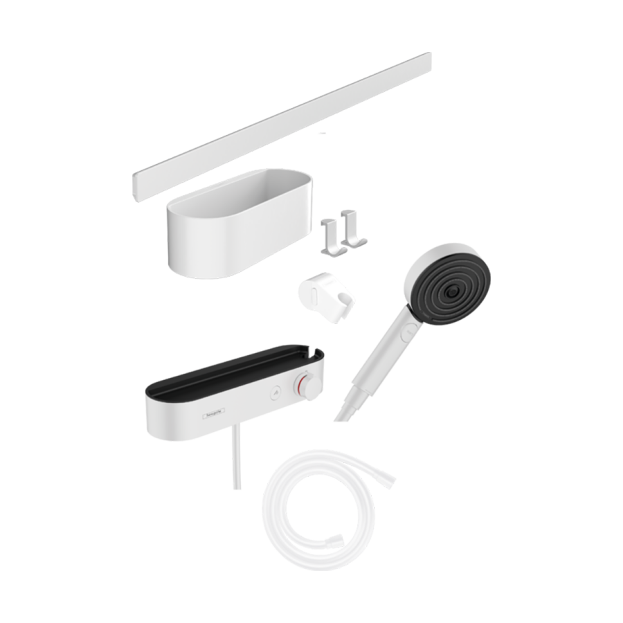 • şunları içerir:: el duşu, termostatik duş, duş hortumu, duvar tiji, saklama rafı, askılık, el duşu askısı