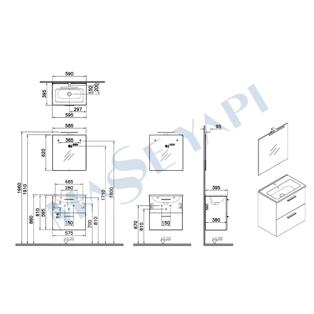 SET, lavabo dolabı, 7461L003- 0002 seramik lavabo, düz ayna ve LED aydınlatmadan oluşmaktadır